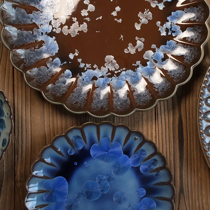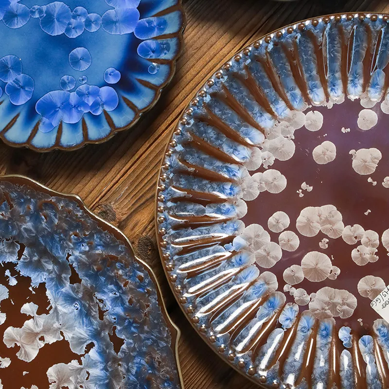 نمط التزجيج الكريستالي: يحتوي السطح على أنماط بلورية غير منتظمة ممزوجة باللونين الأزرق والأبيض، تتشكل بشكل طبيعي أثناء الحرق بدرجة حرارة عالية - كل قطعة لها تصميم فريد لا يتكرر.