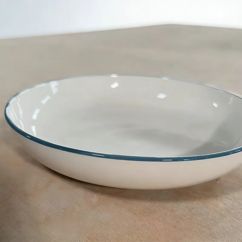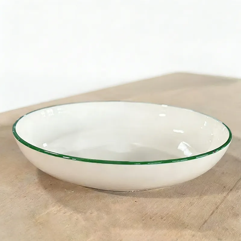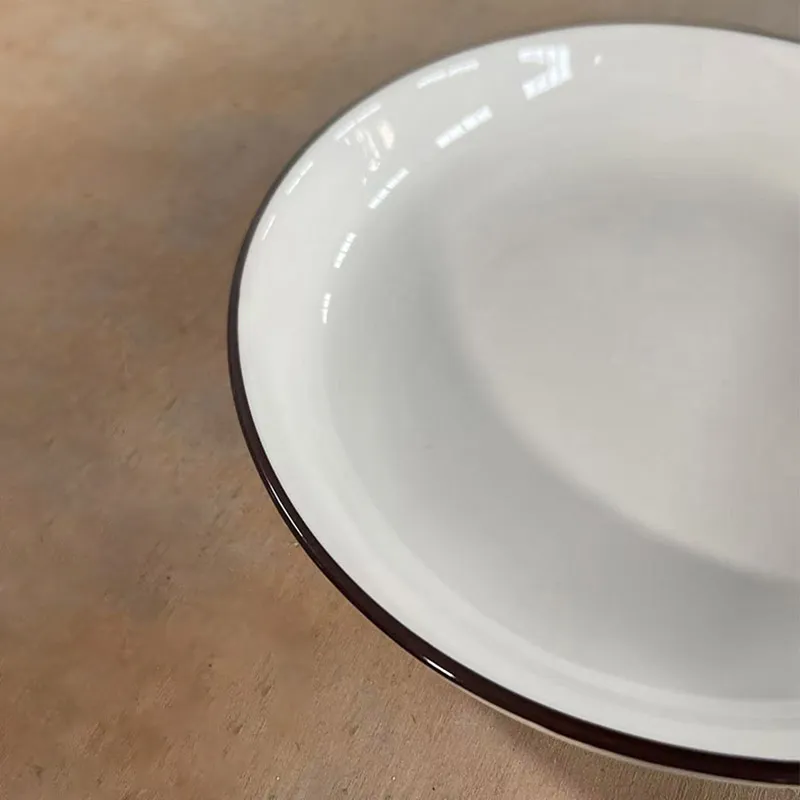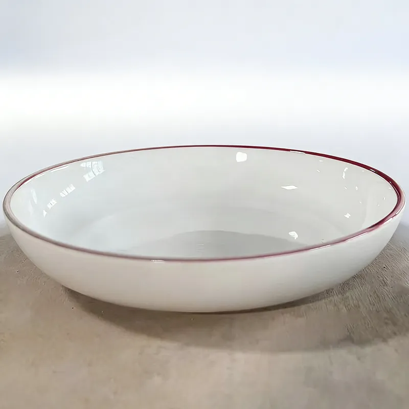 乳白色のボディにワインレッドのリムがエレガントなホワイトセラミック製ボウル。電子レンジ、食器洗い機、オーブンにも対応しており、毎日の食卓、ご家族でのご使用、大量ケータリングに最適です。お見積もりはお気軽にお問い合わせください!