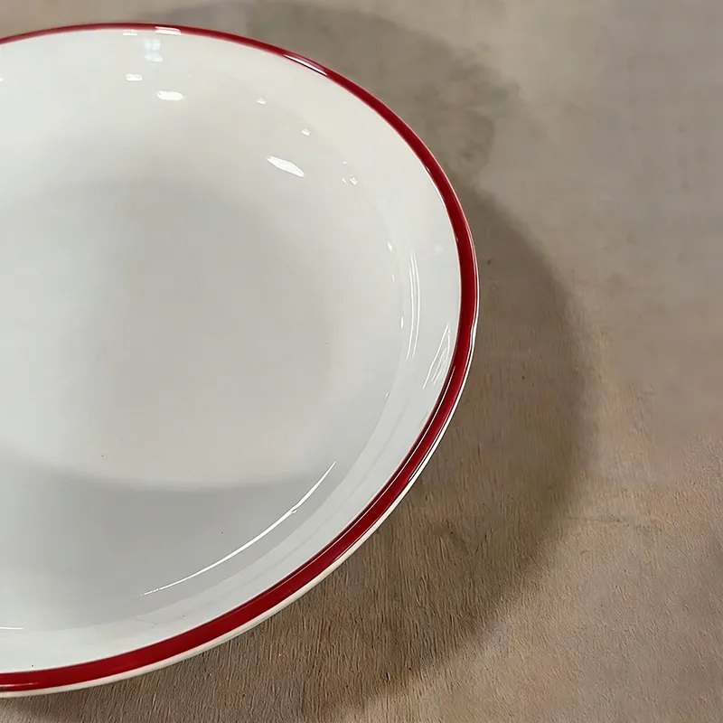 白いセラミックボウル卸売、レストランの赤い縁ラウンドサラダヌードルボウルのサプライヤー