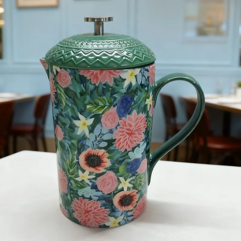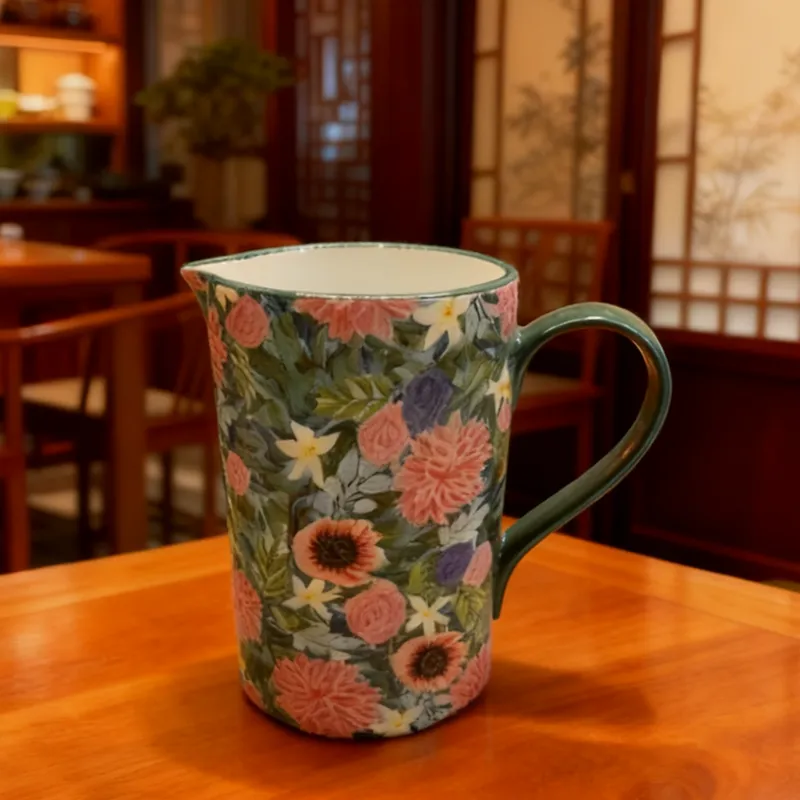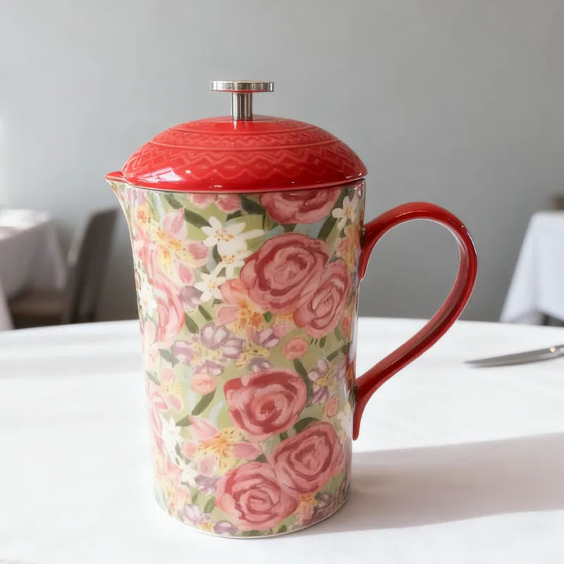 Artistic hand-painted flowers: The main body features a colorful floral pattern, creating a natural and warm atmosphere. The colors are bright and artistic. The lid, spout and handle are red, forming a sharp contrast with the floral pattern, which has a strong visual impact.