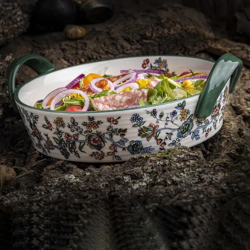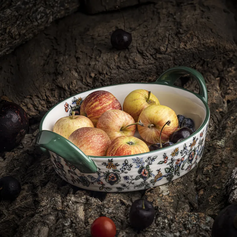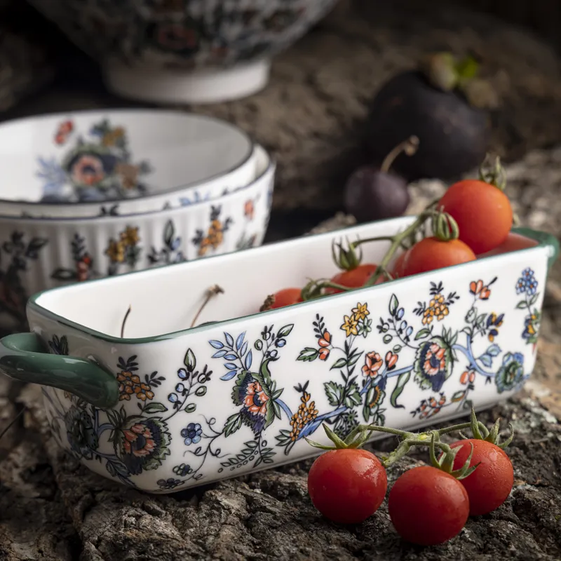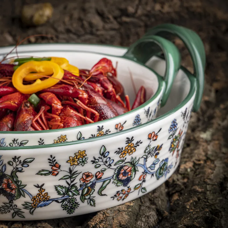 Welcome to wholesale ceramic baking dish, in-glaze decal, vivid floral pattern, double ear handle design, suitable for home & commercial use. Bulk in-stock ceramic bakeware available, fast delivery and global shipping. Contact us to get a quote!